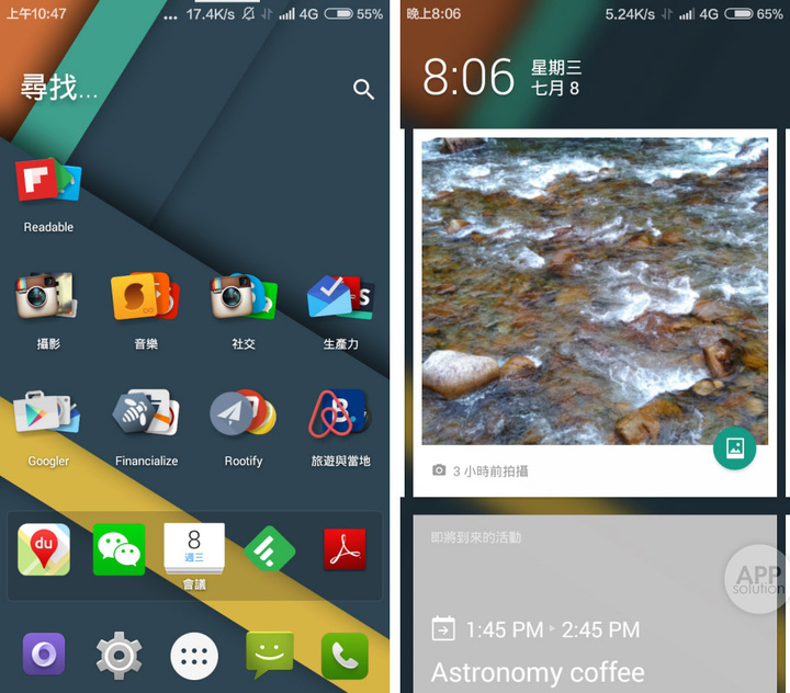 有多少人知道,其实 iOS 9 的分时间段应用预测功能,在 EverythingMe Launcher 中早就已实现。启动器的首页,会有一栏预测列。你可别小看这一列,它的使用频率可以非常之高。因为它除了可以显示时间外,还会根据用户的习惯,在当前时间提供特定的应用、日历、新闻或者近期拍摄的照片。对了,使用越多,识别就会越准确喔!