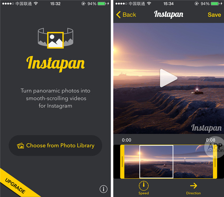 聪明的开发者为用户考虑到了这一需求,而且想到一个巧妙的办法。只要使用 Instapan,全景照片就会被转换成一段缓慢移动的视频,从而实现在 Instagram 上分享全景照片的愿望。此外,Instapan 还支持调整全景照片移动的速度与方向。