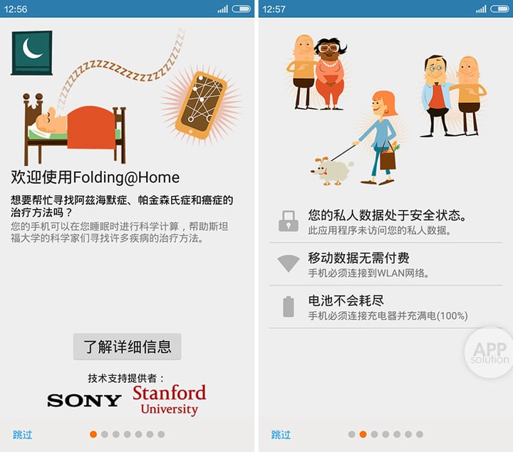 Folding@Home 不依靠超级电脑,它的运算程序分布在成千上万的个人终端之中。如今的智能手机在数量和性能上都十分可观,这款由 Sony 与斯坦福共同推出的 Android app,便是为了将更多的移动终端纳入到这项工程之中。