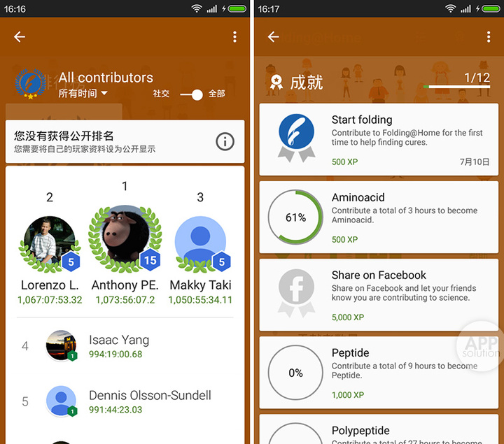 Folding@Home 还支持 Google Play 游戏的成就系统。通过贡献计算时长、获取成就,你能将自己的善意分享给好友和整个世界。