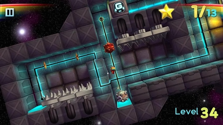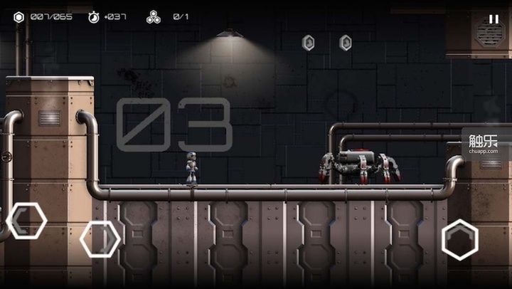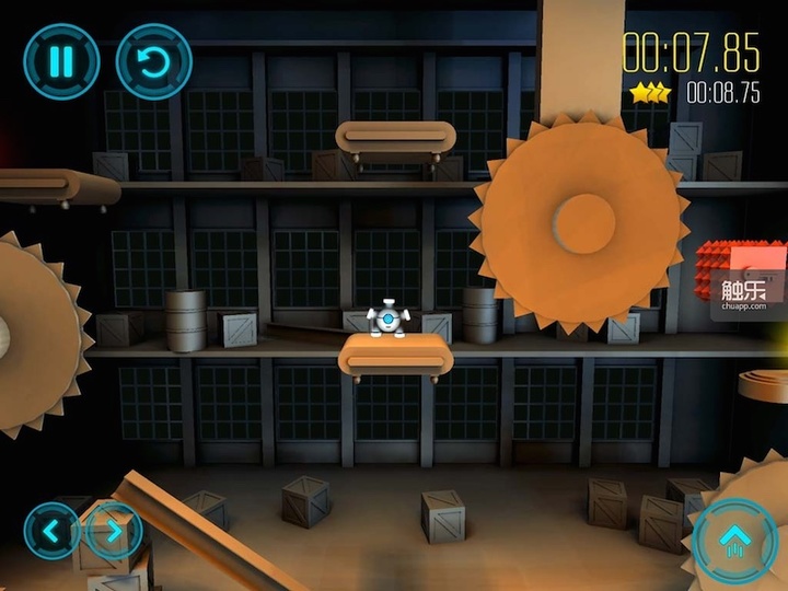 对于前面那些儿女情长的故事,《翻滚吧机器人》表示一概不屑。这是一款平台过关游戏,游戏中玩家操纵一个小小的,带着 5 个吸盘的机器人在场景中爬上爬下,跳来跳去,避开可怕的齿轮,最终拿星星过关。