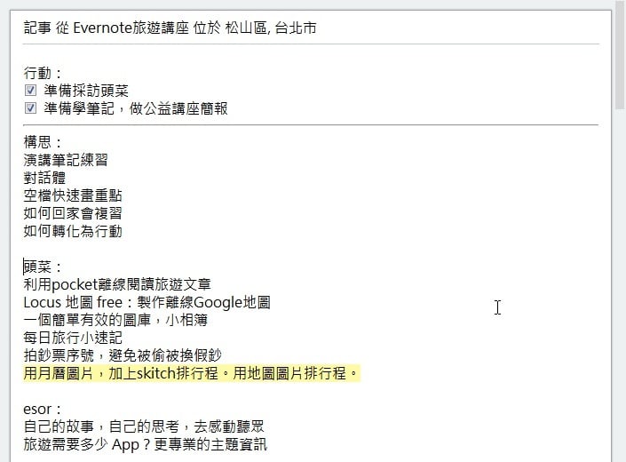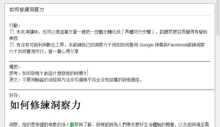 我常常在「电脑玩物」推广行动笔记的概念,不是用行动装置做笔记,而是让笔记产生行动,三层笔记让我们聚焦在做完笔记后下一步延伸出什么具体行动。 - 保留过程