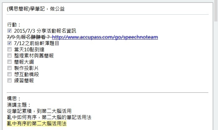 - 行动层:上台的日期时间与地点,写在行动层以免忘记。但更重要的是我也会在简报已经完成的上台前,再把重点归纳一次放在行动层,好让自己上台报告时明确抓住核心。