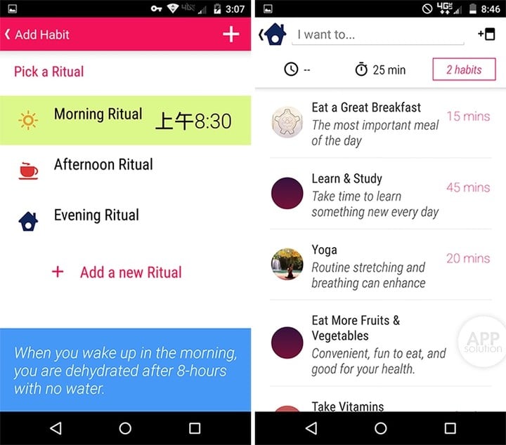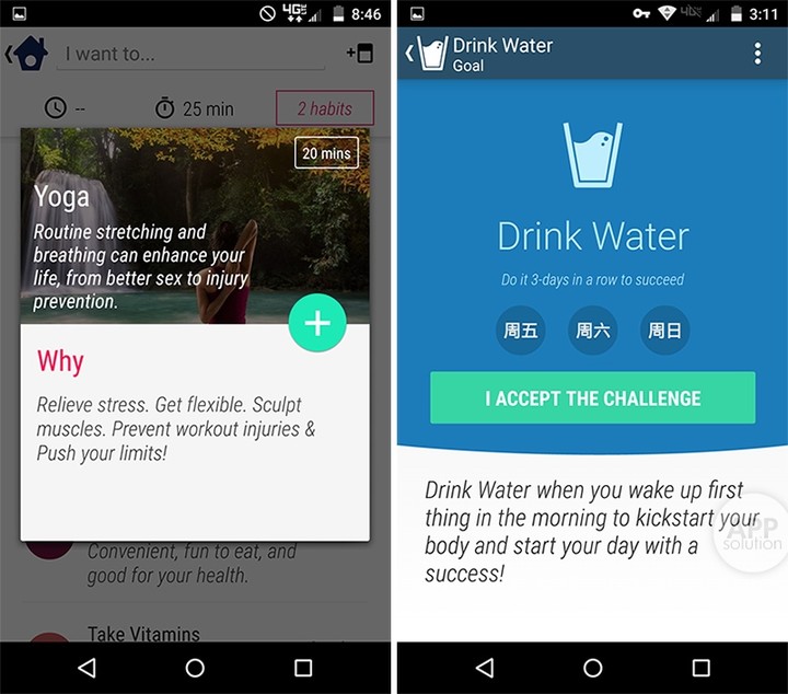 不同习惯带来的好处和具体耗时早已标记清楚,只需要按照喜好来选择。但如果纯粹的人工操作,也就谈不上智能了,所以系统会根据的安排,不定期地推荐一些新的习惯,如果希望提升自己,当然轻松接收挑战。