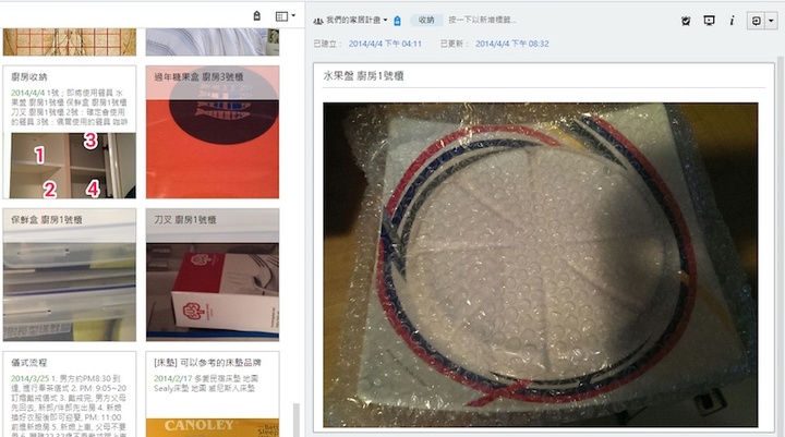 我的老婆有一次就很兴奋的跑来跟我说,因为朋友要来家里吃饭,她一下子找不到水果盘放在哪里,于是想起我常常说的会把这些东西的存放位置记在笔记本中,她就去我们共用的这个记事本搜寻,没想到真的找到水果盘的位子。