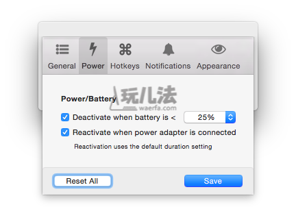 在 AMH 的个性化设置方面,你可以看到以剩余电量为触发器的休眠状态开启机制,比如当电量低于 25% 的时候,Mac 自动进入休眠,而插上充电器后会重新激活放休眠机制,非常人性化: