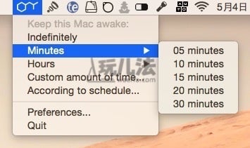 不得不承认,Amphetamine(后面我们简称为 AMH)是按照 Caffeine 为参考目标而进行优化设计的。图 1 是 AMH 的默认操作菜单,图 2 是 Caffeine 的操作菜单,前者很聪明的把 Minutes 和 Hours 细化成独立菜单供用户选择,但这还不够,看一下段落: