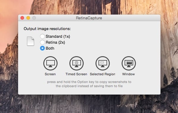 RetinaCapture 是一款专为 Macbook Pro with Retina 用户设计的截屏软件,可以同时生成 2x 和 1x 两种级别的图片,分4种截图模式:整屏截、定时截、选择截、窗口截,保存格式有 PNG、JPEG、TIFF 三种,这款软件特别适合做网站,写博的朋友,可以为 Retina 和 Non-Retina 设备提供相应分辨率的图片。