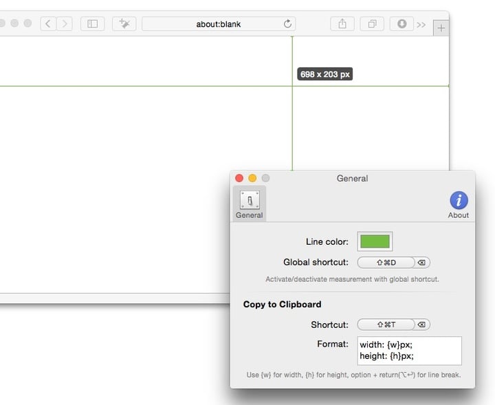 现在有了 Dimensions 这款软件你就能直接对目标物尺寸进行测量了。Dimensions 非常智能,她能够灵活的对窗口,图标,图片,窗口之间的距离,网页元素之间的距离进行以 PX(像素)为单位的测算,而且能够直接自定义 CSS 参数,将{w}与{h}两个参数直接连带 CSS 样式标签拷贝到系统剪切板里。
