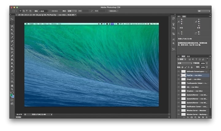 Softmatic ScreenLayers 可以将截取的屏幕图片按 PSD 格式保存到本地,图片里的每一种元素都被单独放入一个独立的layer,比如 Menubar(里面每一个 Icon 都会单独占据一层)、Finder 图标、Dock、System、Window、Mission Control 等元素。