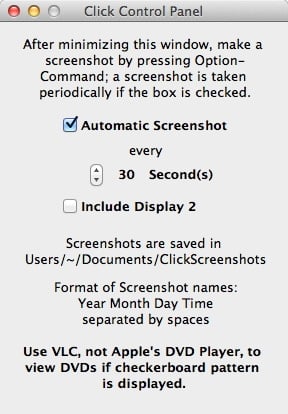 Click 是一款自动截屏小工具,勾选「Automatic Screenshot」后,将设置窗口最小化,按一下「Option + Command」系统会按间隔时间自动连续截屏,间隔时间最小为 1 秒,此外她还支持「Display 2」第二屏的截取,所有截图会被存储在 User/Document(文稿)的 ClickScreenshot 目录下。