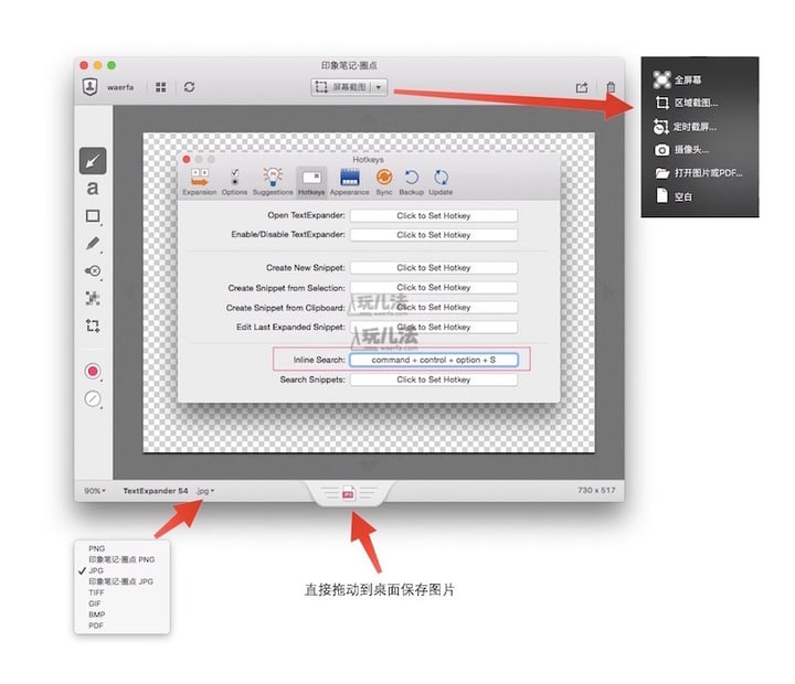 Evernote 家出品的截图 + 标注 + 管理的综合工具,可将图片同步到 Evernote 保存,截图功能强大,提供了利用 Facetime 前置摄像头即时取景并生成截图的功能,另外还是除了 Napkin,我比较喜欢用的图片标注工具。Evernote 在查看/编辑图片时,下方有一个标识图片后缀格式的区域,在这个区域使用鼠标或触控板进行拖拽操作可直接把图片导出到桌面上。