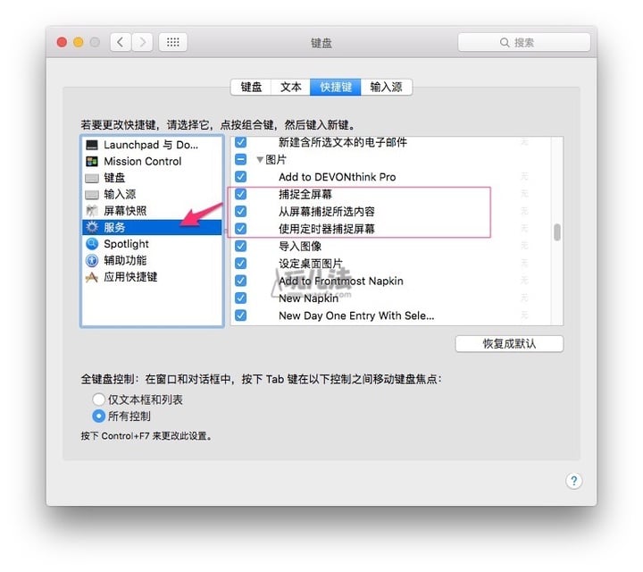 OS X 自带的 Mail、TextEdit 等应用程序内也内置了截图功能,其实都是调用的同一模块。比如在 TextEdit,在选择「多信息文本」模式后,右键菜单里可直接选择「从屏幕捕捉所选内容」这个截图功能,另外在「偏好设置-键盘-快捷键-服务」菜单里你还可以丰富这个右键菜单里的截图动作,比如勾选「捕捉全屏幕」和「使用定时器捕捉屏幕」的动作。