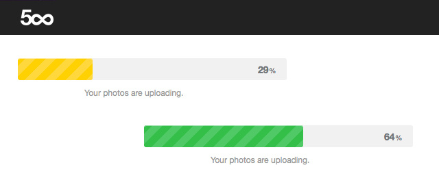 500px 的照片上传进度会根据完成度的百分比显示不同色彩,初始阶段为黄色,进度过半为绿色。