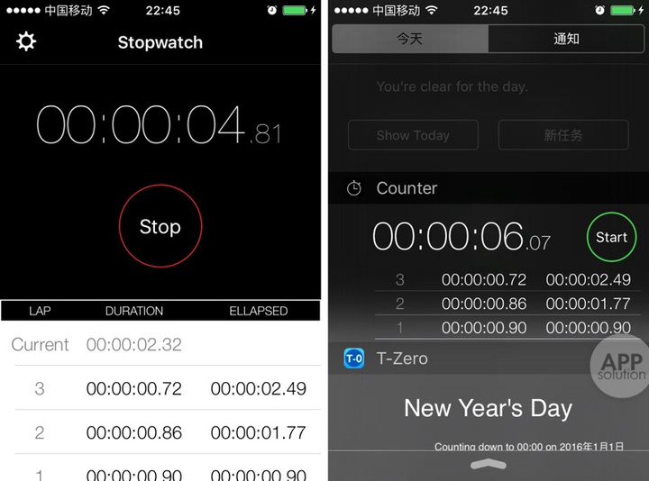 另外在 Today Widget 中就可以直接倒计时和秒表打点这个功能也很强大。不过由于 iOS 后台的限制,倒计时功能需要在设置好时间后再点按一下进入应用中,才可激活开始计时。而秒表计时和打点功能却不受这个影响,可以直接使用。