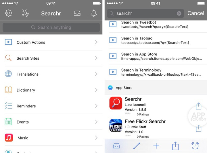 另一方面 Searchr 也支持在 Today Widget 快速搜索,所以我经常会用来搜索安装自己感兴趣的应用。然后通过自定义的动作,在 Appshopper 中搜索,把该应用加入 My apps 或者 Wish List 中。不过,Searchr 不能搜索出中文名字的应用,所以还是需要自定义添加个在 App Store 中搜索,当然你也可以直接在 Spotlight 中搜索。