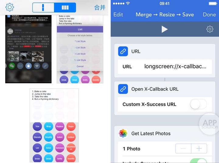 这里讲到的图片类是指简单的图片拼接处理和思维图创作应用。首先推荐的是 LongScreen。它能做的就是将手机内的截图按顺序拼接成长图,或者横向、竖向拼接,还有自动清理状态栏的功能。对于经常写应用评测的人来说比较有用。当然我最爱的还是它支持 URL Scheme 拼接和 x-callback-url 功能。