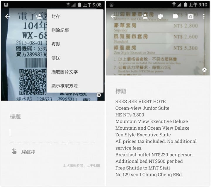 另外一个在 Google Keep 值得期待的功能是:「把语音自动转文字」、「把照片自动转文字」。之所以说值得期待,是因为我觉得实用性上还没有那么完美支持中文,但可以期待未来对中文用户也很有用。