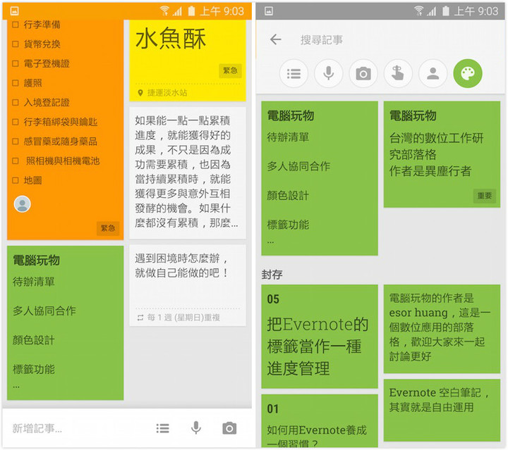 我第一个会利用的就是「笔记的颜色」,透过不同的颜色可以凸显关键的笔记,或是把相关的任务群组在一起。我的方法是用笔记任务的类型来决定笔记的颜色,例如和「电脑玩物经营」有关的卡片都是绿色,和生活待办清单有关的卡片都是黄色,一些日记内容是白色,而特别的项目则再给予特别颜色。