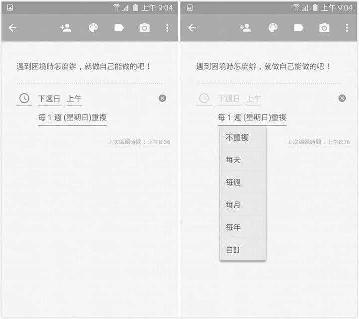 作为任务管理的用途,Google Keep 当然也可以设定时间提醒,但我觉得更好用的是他可以设定「周期提醒」,让我们循环的记住某一件重要的事情。我自己设定周期提醒的应用方法是用在「某些我想要重复学习的东西」,例如最近学到的一个很重要的观念,我会设定重复每周提醒,让自己每一周都看到这段话几次,这样就慢慢让自己复习,并记住这个观念。