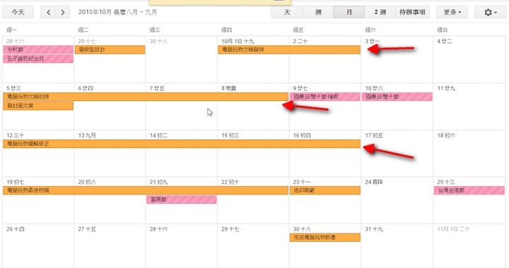 但我会把某几天设定「属于这一天最重要的任务」,这就像是 Google 日历上的全日行程,他会显示成一个色块,让我很清楚的知道这一天我要以做什么工作为重心?至于在这一天的什么时间做?那通常就是这一天任何有空的时间就应该执行它。