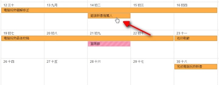 例如我要写一本电脑玩物的数字工作方法新书,有了一个预订出版日期后,我就在日程表先写上出版日、送印刷厂日等明确的截止日期(下图是假的范例,不要当真了),这是第一步。