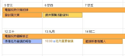 这时候,我会把这个需要一段时间执行的进度,用多日活动的方式加入日程表中,这在 Google 日历上就会显示成一个类似「甘特图」的进度条。