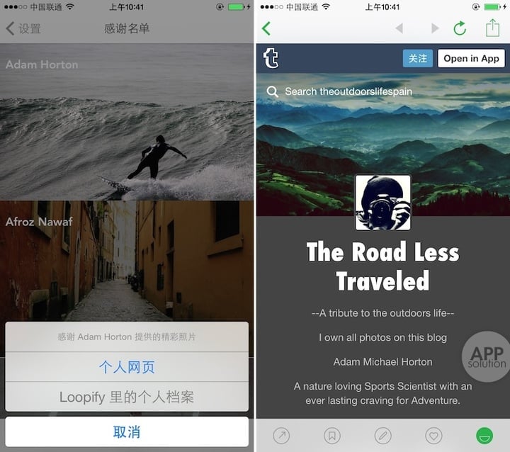 值得一提的是,Loopify 对照片提供者进行了感谢,提供了他们的个人网页(浏览需翻墙),同时公布了所使用的函式库,体现出开源精神。