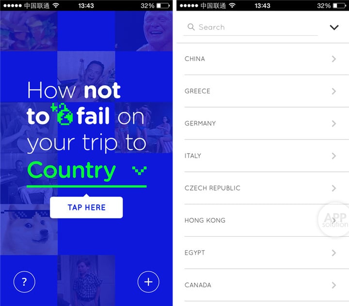 不要以为 FailPop 是个多么正经的 app,它可能很有用,但更多的是有趣。FailPop 搞怪风格的动图暴露了它嘻哈的本质。那么如何在 FailPop 内查看小贴士呢?很简单,首页点击绿色字体「Country」,可以进入国家选择。