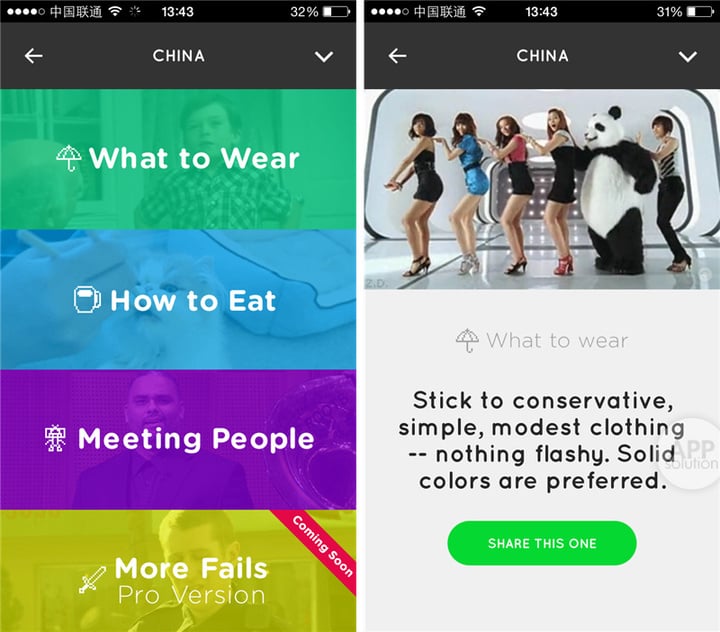 FailPop 提供多个国家旅游的小贴士,旨在让用户以最快的速度了解一个国家的礼节,从而避免被当地人称作「外国游客」的尴尬局面。