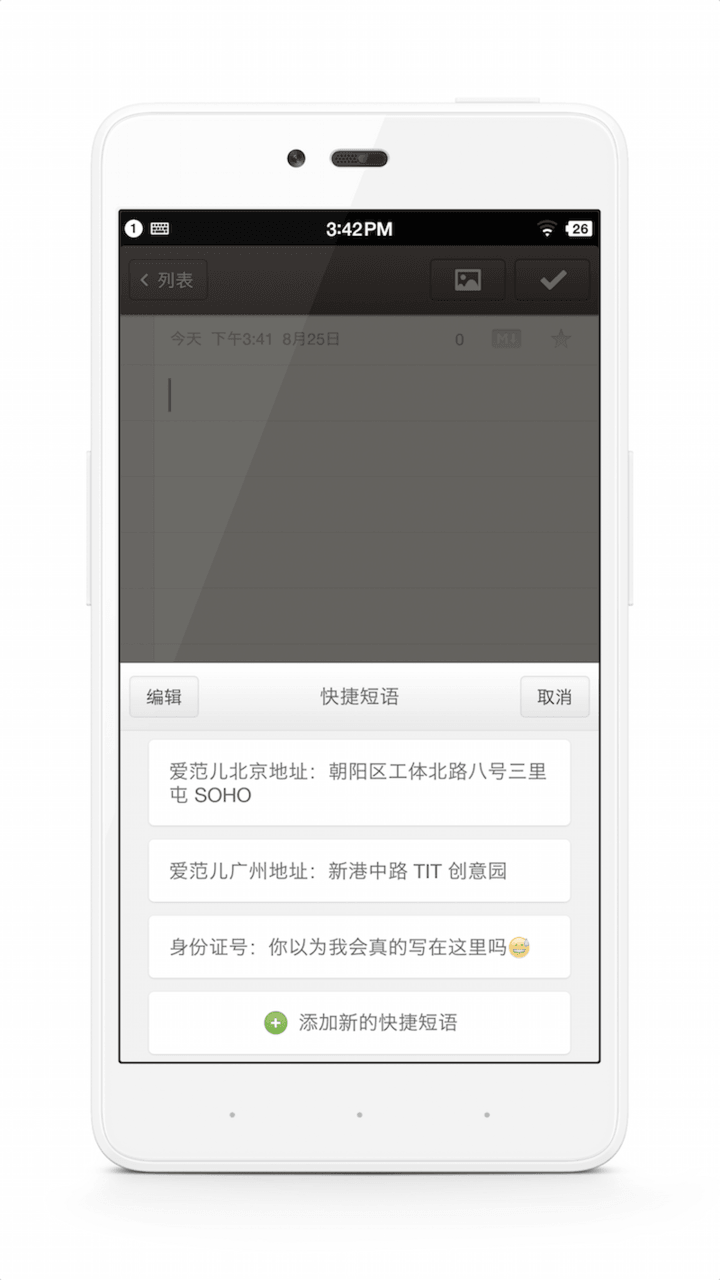 锤子系统 2.0 所用的方案有所不同:你可以在任何文字输入框长按呼出「快捷短语」选项,你可以快速使用现有的快捷短语和添加新的快捷短语。乍一看这使用流程,似乎比常见方案没有太多优势,但实际上,这个方案有两个亮点:一是它全局可用且不受输入法限制,二是它的设置入口比起现有方案要快捷得多。