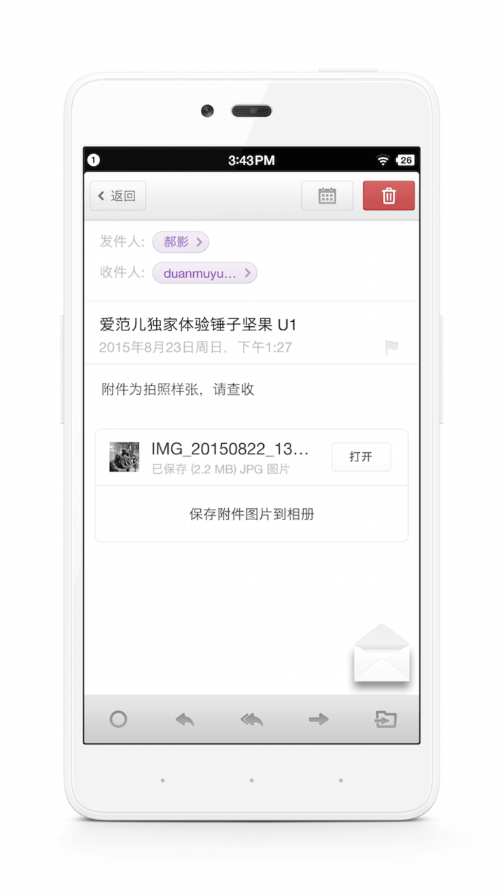 锤子系统 2.0 在自带邮箱应用中引入了很实用的「最小化」功能,你可以随时将编写窗口最小化至右下角,在此期间你不仅可以翻阅其他邮件,甚至还可以直接将其他邮件里的附件「丢」进最小化的编写窗口。