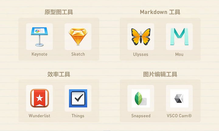 Z:首先肯定会使用便签同类的竞品。另外,工作中主要使用 Keynote 和 Sketch 作为原型图工具,会使用 Ulysses 和 Mou 等 Markdown 工具撰写产品文档,同时会使用 Wunderlist 和 Things 等作为日常效率工具。团队中喜爱摄影的人很多,VSCOcam 和 Snapseed 也是大家都会安装的 App。
