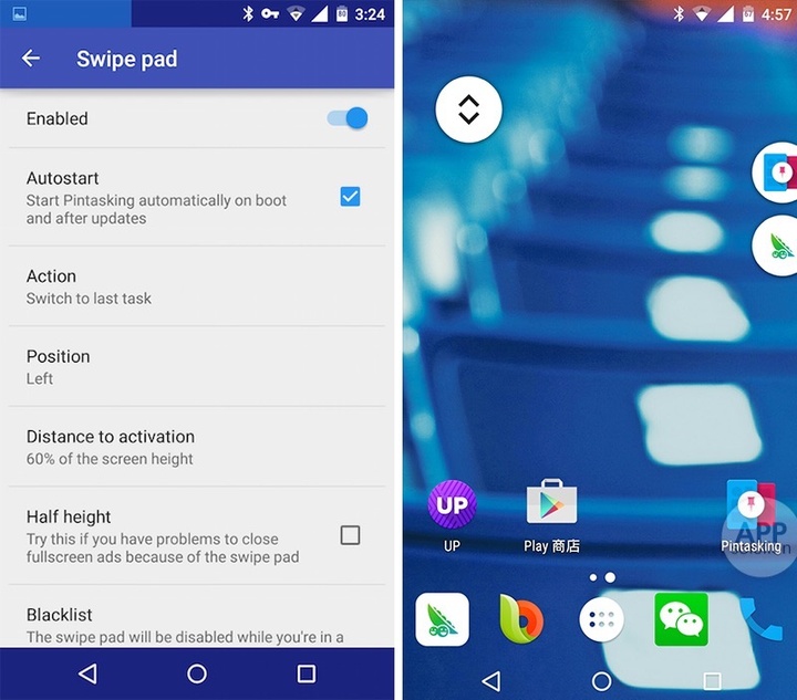 在免费版中,依然包含了一个有趣的辅助工具。你能在设定的通知栏区域中,下滑切换至上一个应用。