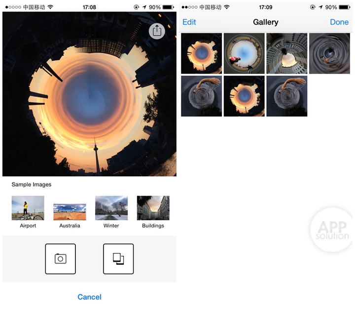 通过这款应用,无论是画面表现平淡或出色的照片,无论是否对称的构图,都能创造出意想不到的效果 —— 它能给图片赋予球形全景特效,看上去就像要被一个奇点吸引进去。