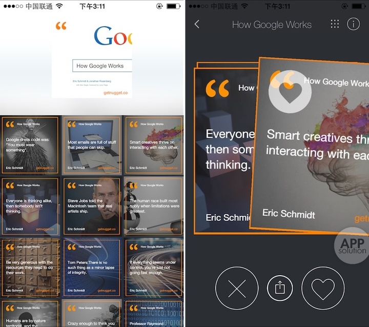 所以有人想,如果把书中的好内容摘录提炼成短句,再制成精美的卡片供人翻阅,是不是就可以在一定程度上解决这个问题呢?于是 nugget 被做了出来。