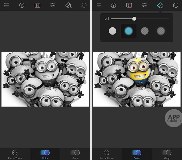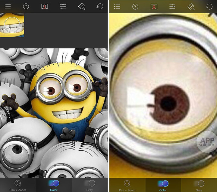 和专注于人像美颜的 App Facetune 一样,Color Splash 中的照片可以无限放大至像素级别,涂抹照片上 App 左上角还会有涂抹处的放大图像可供参照。双重保障之下,手残党再也不必担心涂选区时不慎越界了。