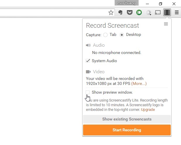 要开始屏幕录影时,只要点击 Chrome 浏览器右上方的「Screencastify」按钮,在弹出的选单最上方选择: