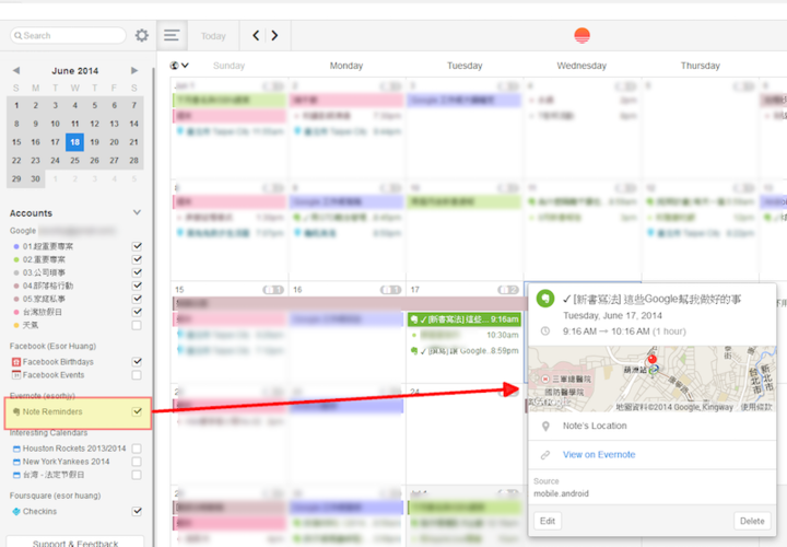 但是我们可以在 Sunrise 中同步我们其他主力工作服务的任务清单,统一在 Sunrise 中查看与管理,例如我自己会同步的有 Google 日历、Google Tasks、Evernote 提醒笔记,还有最近我愈来愈常使用的看板管理服务 Trello 等。