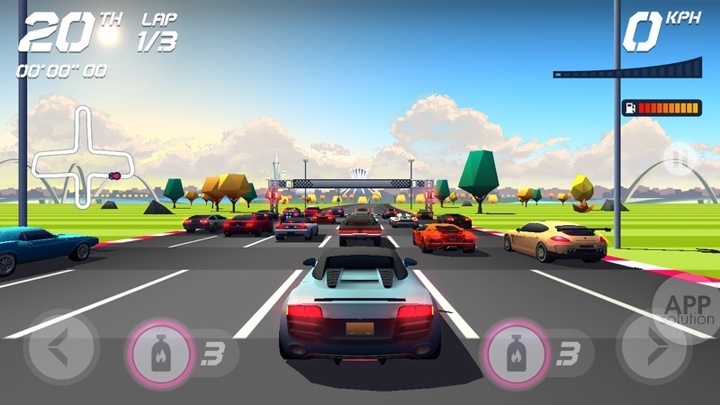 虽然游戏可选重力感应操控,但 Horizon Chase 更加偏袒转向精确的键位操作,在操控手感上,可以用「简单粗暴」来形容:与传统的街机赛车相似,你只需控制左右方向躲避对手,避免在拐弯扑街。
