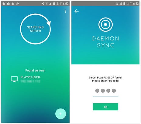 然后我们才打开手机上的 Daemon sync,连上和电脑一样的家中网络,这时就会侦测到家中电脑,只要输入前面看到的验证码,手机与电脑就连线,并且可以开始自动备份了。