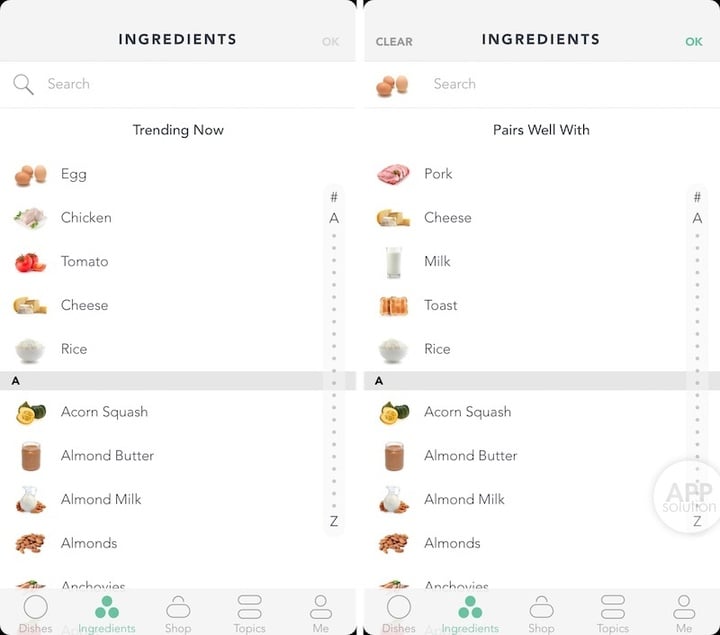 在 Ingredients(材料)一栏,你可以通过搜素食材来获得想要完成的菜品。食材按英文首字母排序,每当你选择一种食材,它都会为你匹配出它认为合适的食材。