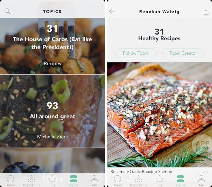 Handpick Recipes 上的菜品图片质量都很高,点进去便能看到所需的配料和其他类似的菜品。如果你对这款菜品满意,可以将食谱添加到自己的 Topics 里,也可以分享到 Facebook、Twitter、Tumblr 和 Pinterest 等社交媒体上。