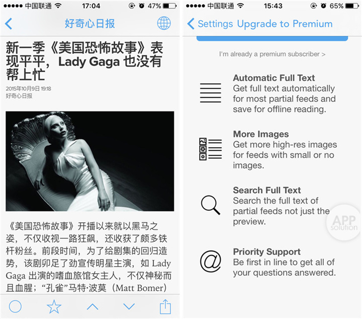最后说说 Newsify 的内购,它支持更好的文字排版、离线阅读,高级搜索,图片优化以及优先的客户服务权。虽然内购看起来很诱人,但是免费版也基本能满足用户的需求了。