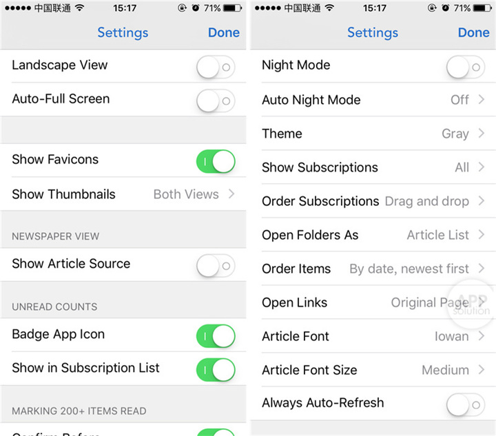 最值得一说是 Newsify 多达几十种的设置功能,完全免费而且能够让用户定制属于自己的阅读体验。这些设置涉及同步、阅读显示、列表排序、文字大小、字体种类、夜间模式、文内浏览器设置等等。在此不一一介绍,请直接看图。