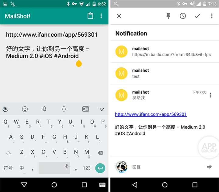 使用方式非常简单,可以直接复制或输入文本后,什么都不需要做,邮件便能自动发送到自己的邮箱中。当然,应用也支持通过 Android 万能的分享机制提交文字或链接。