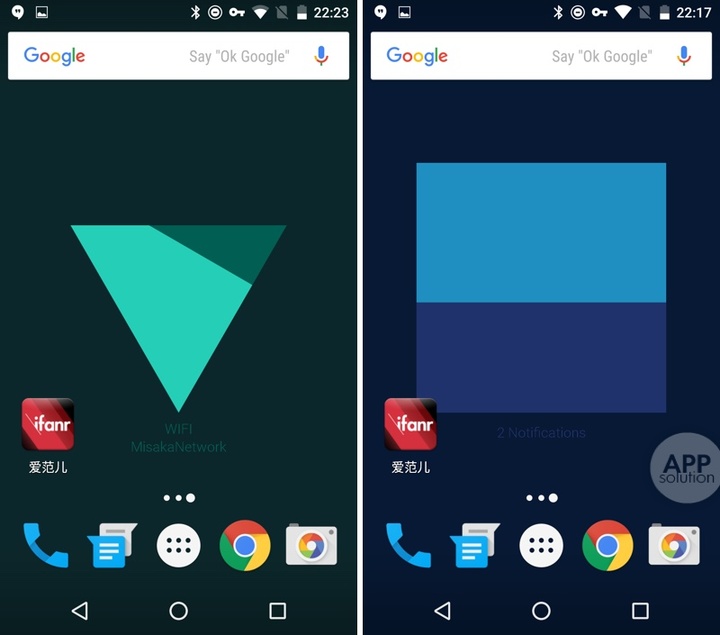 壁纸每次只会显示一个信息,包括网络信号、电池和通知数量。让人大呼好玩的不仅仅是大块简洁的色块,更因为它会根据重力传感器数据,让你的壁纸在手机放置的不同角度下呈现出类似倾斜半满水瓶那种效果,还挺萌。