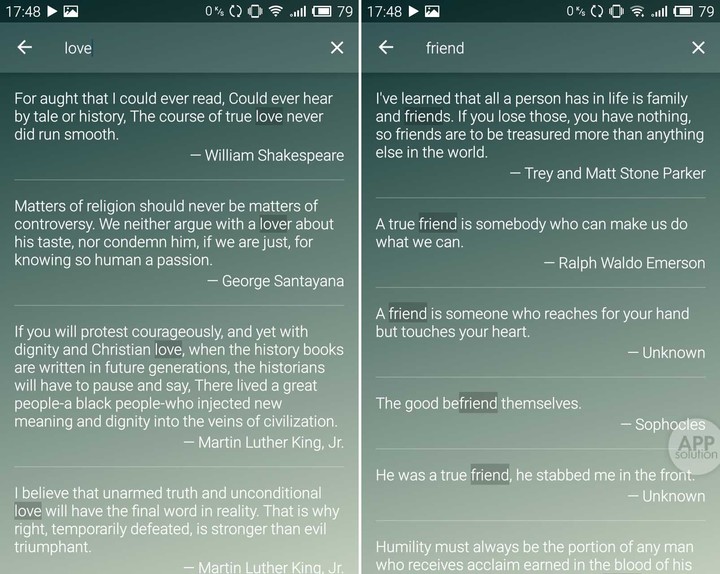 随机按钮左边则是搜索功能,输入不同的单词就能预览所有包含此单词的语录。想找跟「朋友」有关的名人名言 ? 输入「Friend」试一试吧。
