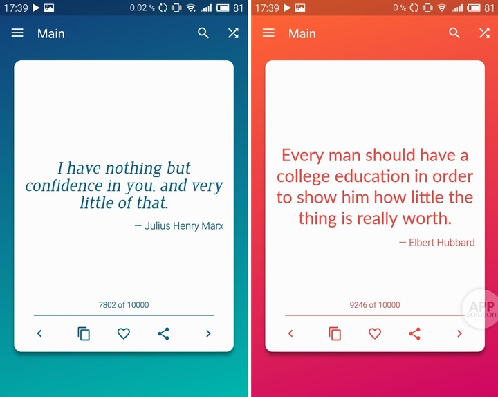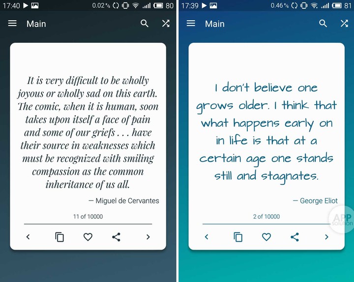 作为一个轻量级文字应用,Great Quotes 主界面非常简洁,内容以卡片形式呈现在屏幕中心,每张卡片底部有三个按钮,分别为复制内容、收藏和分享。