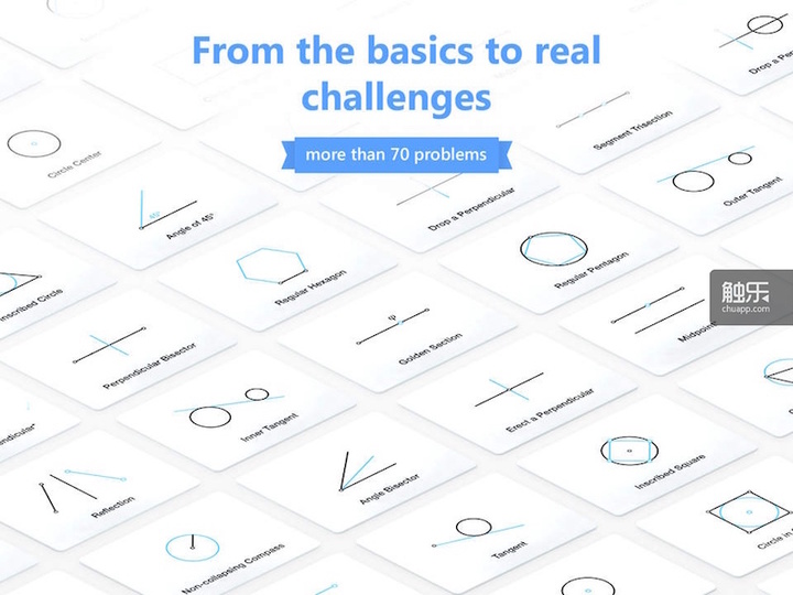 《欧几里得 2》是以上几款应用中我个人最为喜欢的,它的玩法非常简单:先给你两个端点,你各点一下,就得到一条线段;换画线工具为画圆工具,两个点各点一下,就得到以两点连成线段长度为半径的圆。然后就开始组合应用:给你一条射线以及画线、画圆工具,请你画一个 60 度的角;给你画线和画圆的工具,请你做一条线段的中垂线;给你画线、画圆和画中垂线的工具,请你做一个角的角平分线。继而加大难度:请你利用现有工具画一个其中一个端点是三角形端点、另外三个端点是三角形三条边的中点的平行四边形;或者请你利用现有工具在圆内画一个正五边形等等。